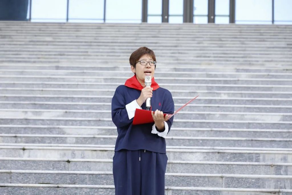 大队辅导员孙晓君带领全体少先队员呼号。“时刻准备着”有力的声音回荡在操场上。