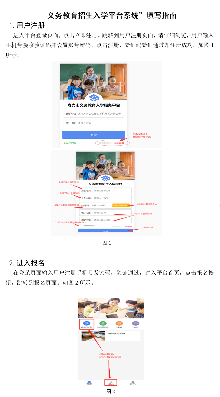 (一)登录平台后完成用户注册,按照提示完成报名信息的填写及材料上传(具体操作说明见后面的附件,家长提前熟悉学会,学校统一安排7月5日对幼儿园大班学生家长以家长会的形式;7月6日晚对六年级学生家长以视频会形式进行专题培训)。
