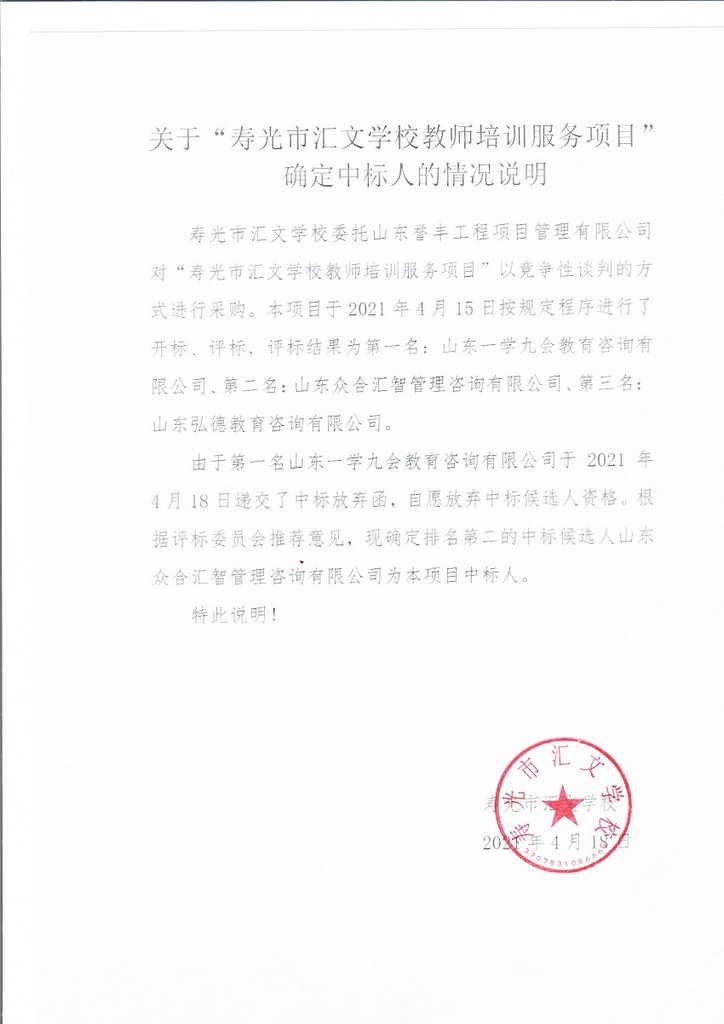 关于“寿光市汇文学校教师培训服务项目”确定中标人的情况说明