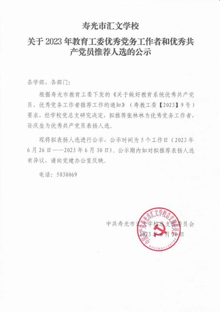 寿光市汇文学校2023年教育工委优秀党务工作者和优秀党员推荐结果公示