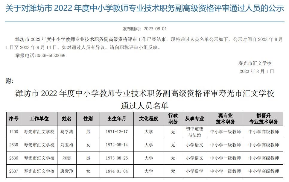 关于对2022年度潍坊市中小学高级教师专业技术职务资格评审通过人员的公示