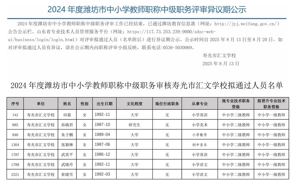 2024年度潍坊市中小学教师职称中级职务评审异议期公示