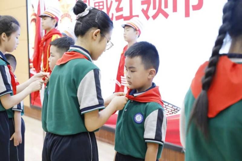 六年级少先队代表为新队员代表佩戴红领巾,队员们的脸上洋溢着笑容。带上鲜艳的红领巾,成为一名光荣的少先队员,牢记习爷爷对广大队员们的殷切希望和要求,努力争做新时代的好队员。