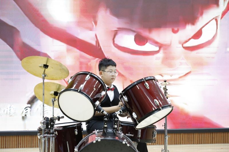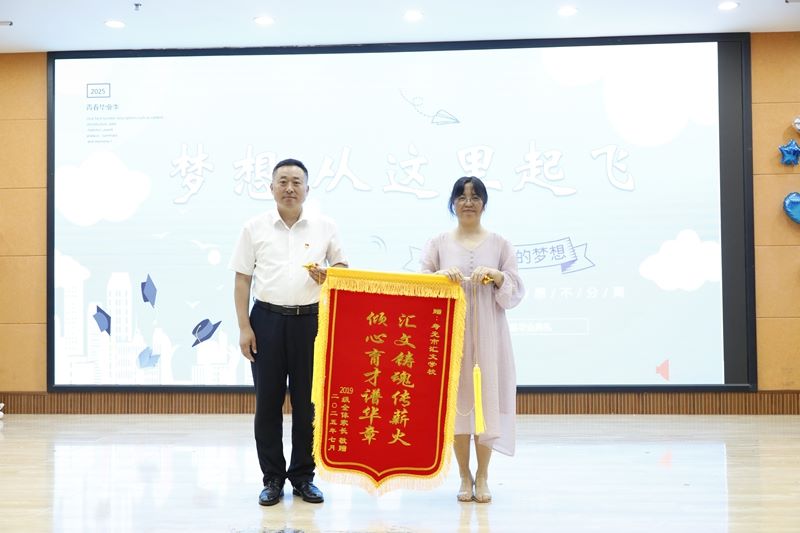 学生、家长代表发言饱含深情,家长合唱《不要慌,太阳下山有月光》传递温暖。架子鼓表演《哪吒》燃爆全场,学生赠书画、家长献锦旗致谢母校。最后,全体齐唱《祖国有我》,“强国有我”的誓言与《再见》旋律交织,这场典礼既是告别,更是新征程的启航,愿少年们带着母校嘱托,奔赴星辰大海!