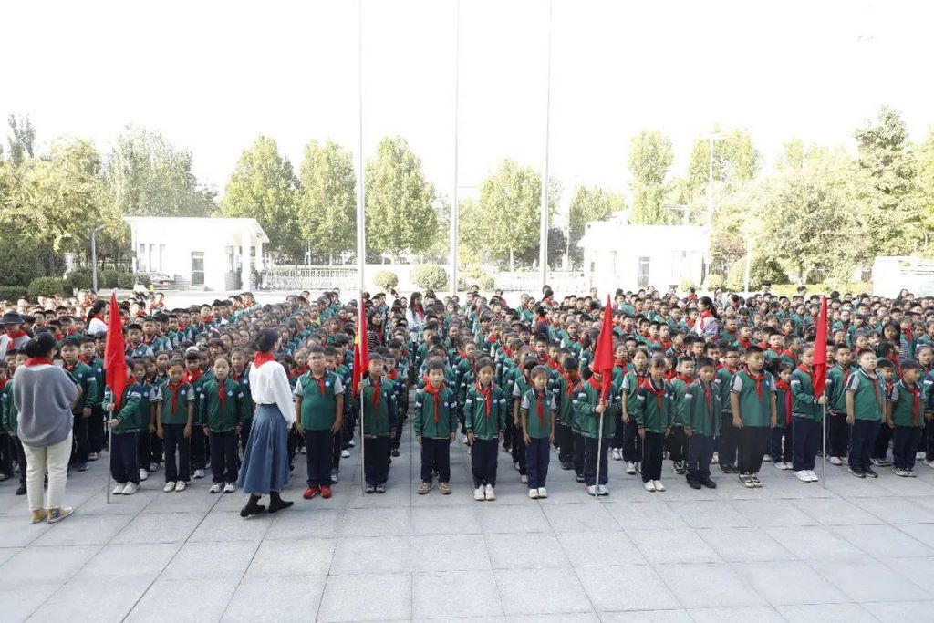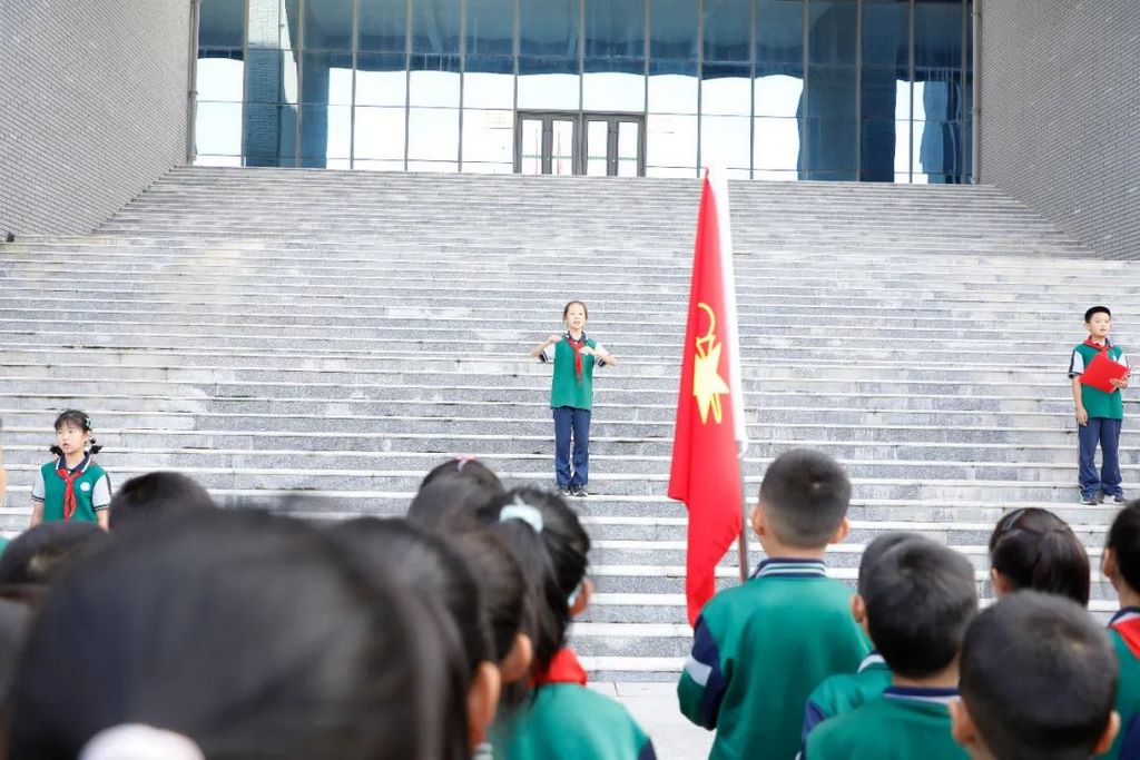 大队辅导员孙晓君带领全体少先队员呼号。“时刻准备着”有力的声音回荡在操场上。