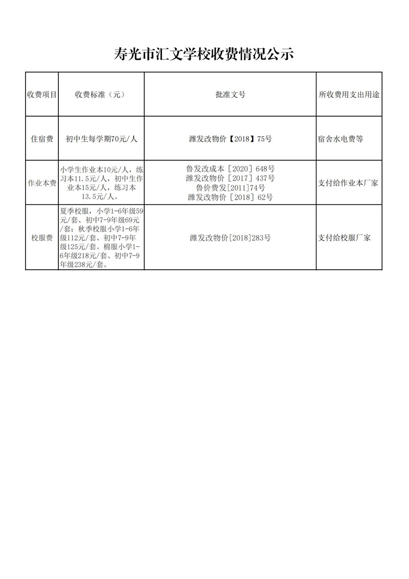 寿光市汇文学校2022年收费标准