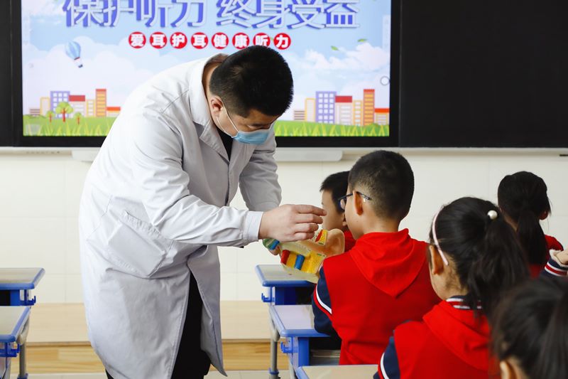 活动中,孩子们认真听取医生对耳朵的详细讲解,医生以耳朵模型为实例,教给孩子们保护听力的方法,以及在日常生活中应该如何避免发生意外问题等,让学生知道人体耳朵的构造,增强对耳部疾病防护的认识,保护听力。
