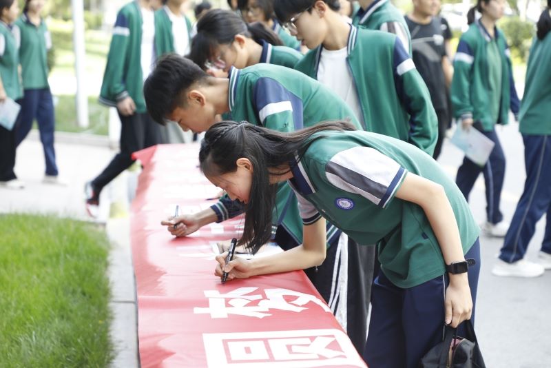 在典礼最后,全体师生合影,学生在象征未来的红色条幅上签字,走过毕业门,师生欢送同学们,毕业典礼结束。
