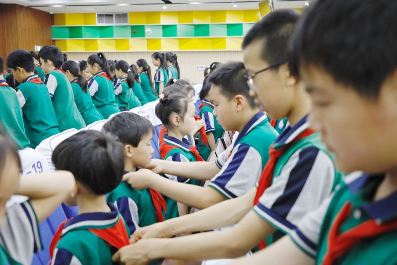 在这火红灿烂、充满希望的季节里,5月29日下午,寿光市汇文学校隆重举行一年级“牢记党的教导 争做强国少年”新队员入队仪式。135名一年级预备队员光荣加入中国少年先锋队,开启人生崭新篇章。